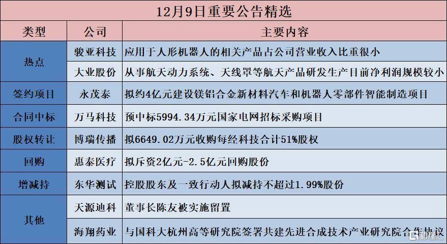 佰奥智能(300836.SZ):预中标2750万元技俩和煦电气(300141.SZ):预中标1.07亿元技俩万马科技(300698.SZ):预中标5994.34万元国度电网招标采购技俩【股权收购】邵阳液压(301079.SZ):拟购买新承航锐100%股份博瑞传播(600880.SH):拟6649.02万元收购每经科技野心51%股权【回购】惠泰医疗(688617.SH):拟斥资2亿元-2.5亿元回购股份宋城演艺(300144.SZ):拟1亿元-2亿元回购股份金固股份(002488.SZ):拟斥资3000万元-6000万元回购股份【增减抓】立新能源(001258.SZ):山东电建拟减抓1%股份奥康海外(603001.SH):鼓舞项今羽拟减抓不超3%股份东华测试(300354.SZ):控股鼓舞及一致活动东谈主拟减抓不逾越1.99%股份神州信息(000555.SZ):控股鼓舞拟减抓不逾越2.9543%股份英派斯(002899.SZ):控股鼓舞拟增抓6000万元-1.2亿元公司股份【其他】天源迪科(300047.SZ):董事长陈友被试验留置海翔药业(002099.SZ):与国科大杭州高档筹办院签署共建先进合成技艺产业筹办院配合契约举报/响应