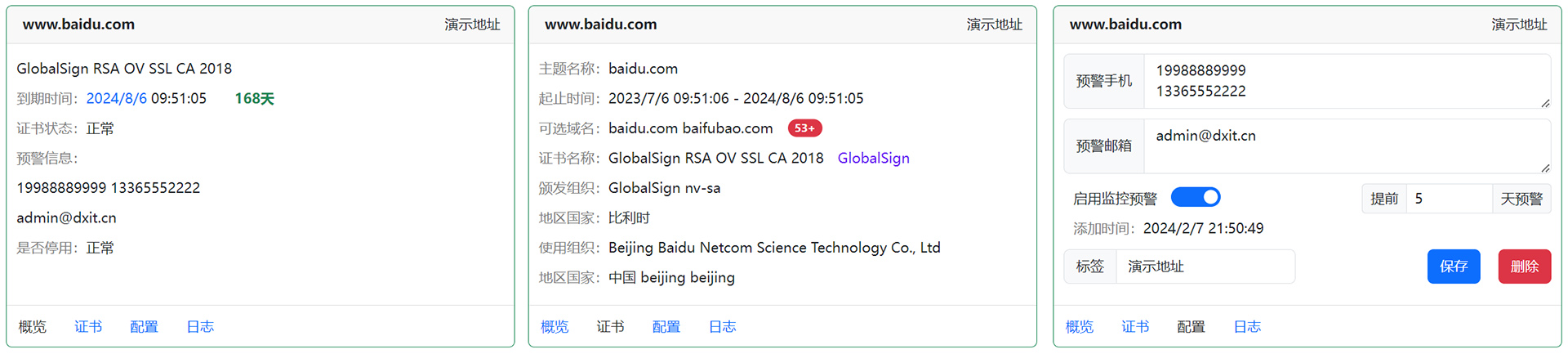 網站證(zheng)(zheng)(zheng)書(shu)監控系統(tong)還可監控網站證(zheng)(zheng)(zheng)書(shu)是否匹配,避免(mian)錯誤安(an)裝(zhuang)證(zheng)(zheng)(zheng)書(shu)。支持(chi)自(zi)定義設置到期(qi)(qi)前N天(tian)預(yu)警,且不會(hui)在晚上打擾。后期(qi)(qi)會(hui)推出證(zheng)(zheng)(zheng)書(shu)裝(zhuang)訂(ocsp)檢測及(ji)生成,可解決國外證(zheng)(zheng)(zheng)書(shu)驗證(zheng)(zheng)(zheng)慢的問(wen)題。